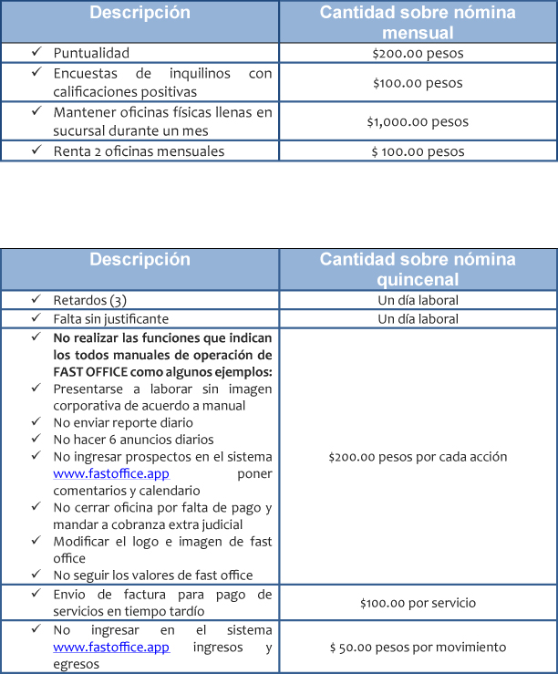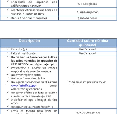 8. Está prohibido negar el ofrecimiento de oficinas de otras franquicias FAST OFFICE al momento de realizar el proceso de ventas por conveniencias particulares o situaciones personales, esta acción es motivo de penalización y/o rescisión de contrato.